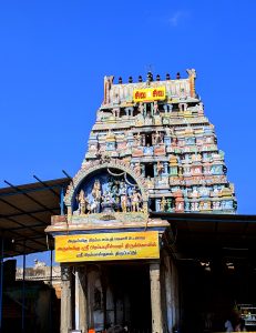 five-tiered rajagopuram, the temple’s gateway tower. Six daily rituals and three yearly festivals are